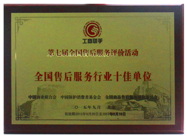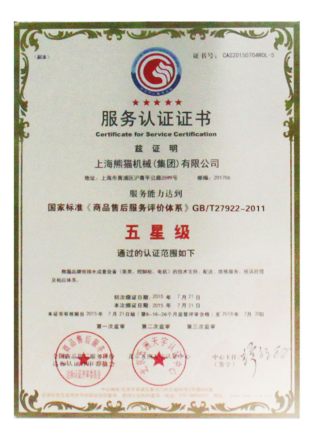 2015年9月20日,第七屆全國售后服務(wù)評(píng)價(jià)活動(dòng)發(fā)布會(huì)在北京舉行,會(huì)上我們上海熊貓機(jī)械(集團(tuán))有限公司榮獲“全國售后服務(wù)行業(yè)十佳”稱號(hào);并在會(huì)上由中國輕工業(yè)聯(lián) 合會(huì)會(huì)長步正發(fā)為我們熊貓頒發(fā)《商品售后服務(wù)評(píng)估體系》五星級(jí)認(rèn)證證書。